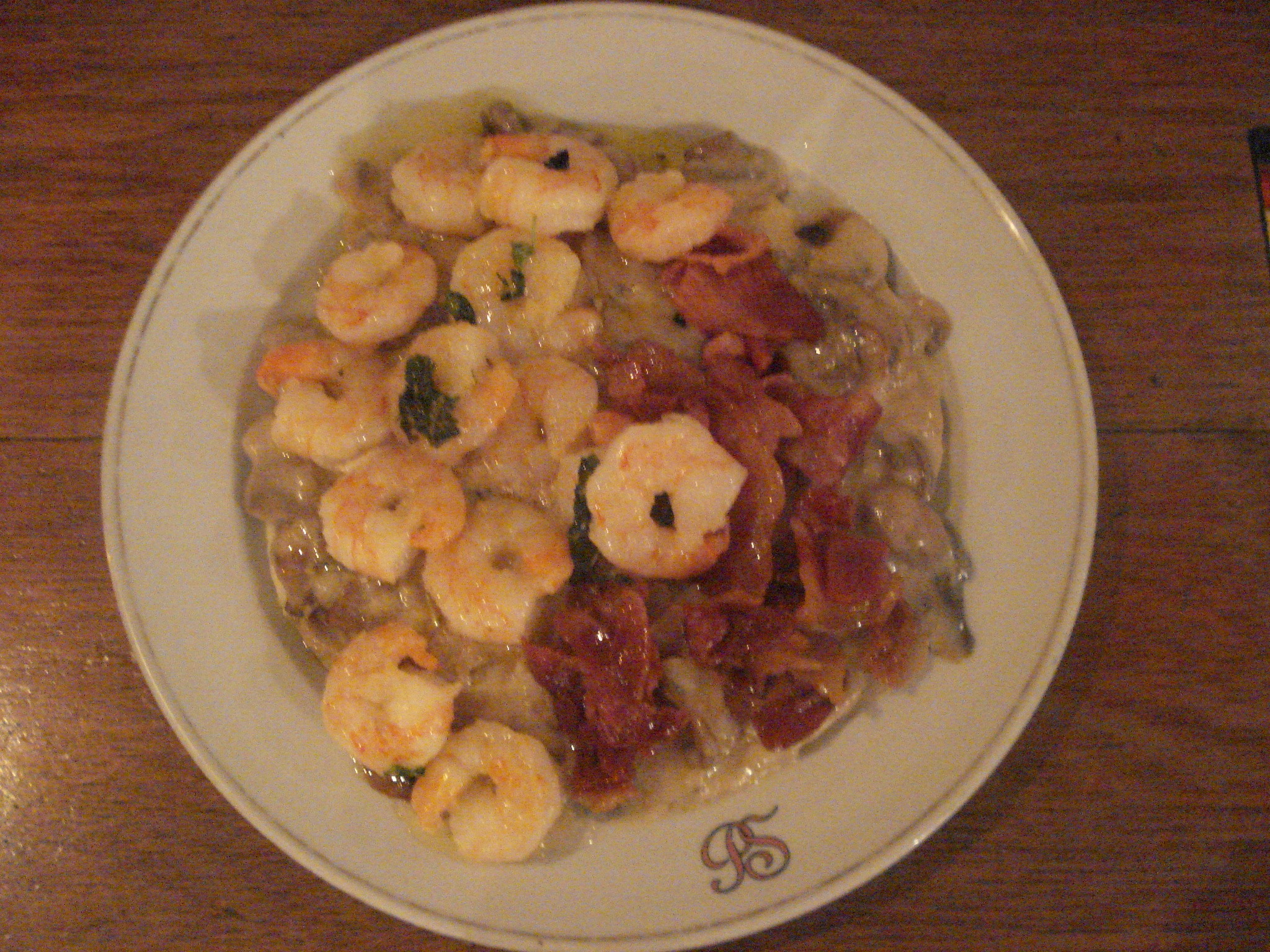 Langostinos al ajillo o al pesto con champiñones en salsa bechamel y tocineta.