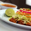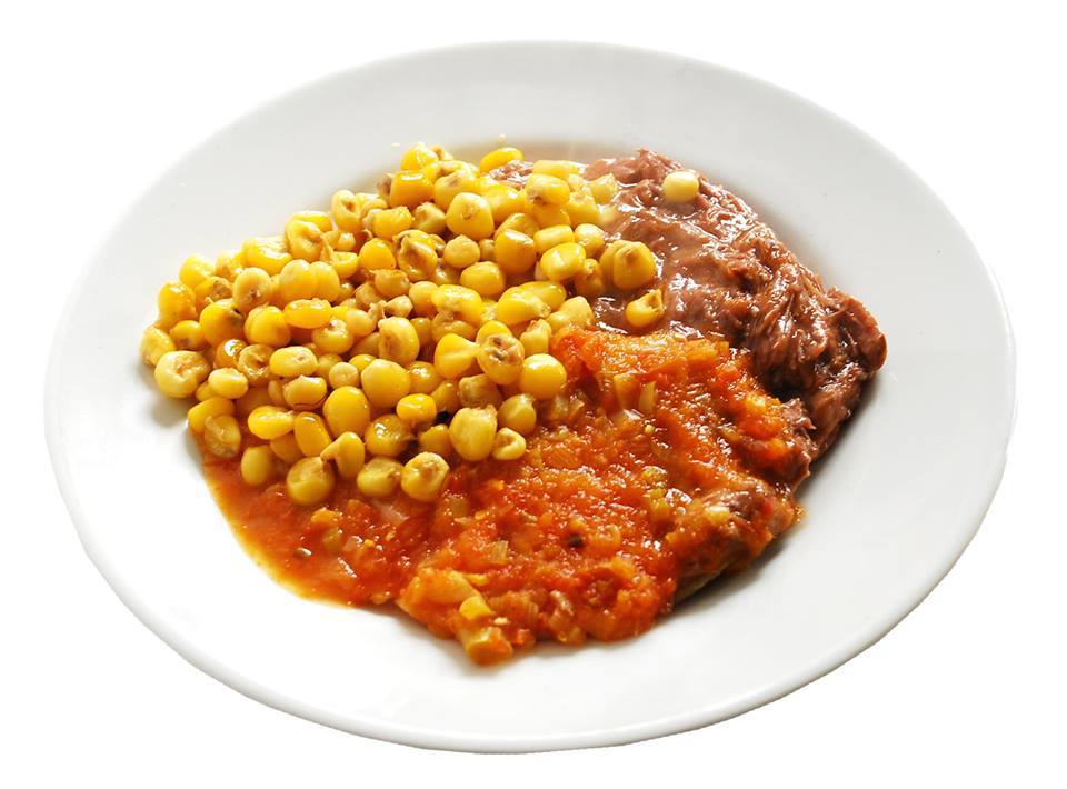 Carne o pollo, fríjol con chile y guacamole.