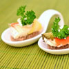 Arepa con queso fundido a la parrilla, Langostinos al ajillo o al pesto, champiñones es salsa Bechamel y tocineta.