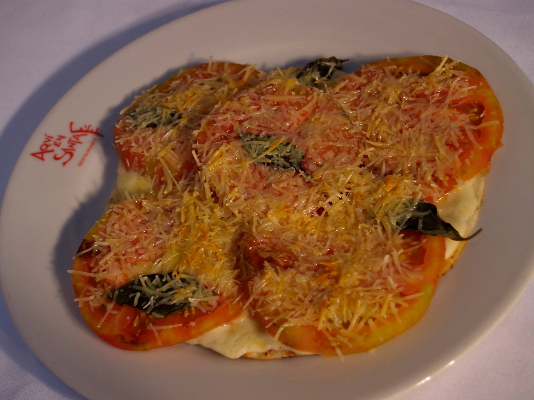 Tomates con albahaca salteados en aceite de oliva al gratin y arepa con mantequilla.